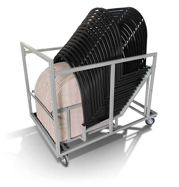 Kurvo tables have 2 specially designed carts for storage and transport with the table tops left in them or not (12 Cocktail tables / 16 coffee tables). The specially designed carts for both Kurvo and Stako table frames and tops offer a complete solution for storage, transport, event setup, and take down. It can streamline operations and enhance the overall experience for you and your clients.