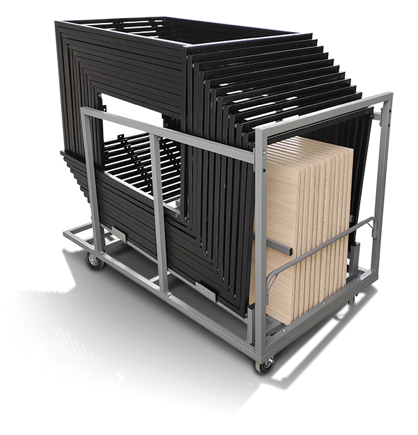 Stako tables have 2 specially designed carts for storage and transport with the table tops left in them or not (12 Cocktail tables / 16 coffee tables). The specially designed carts for Stako table frames and tops offer a complete solution for storage, transport, event setup,and take down. It can streamline operations and enhance the overall experience for you and your clients.